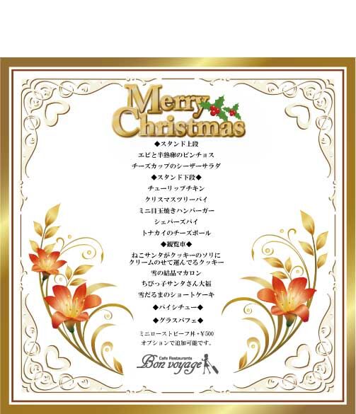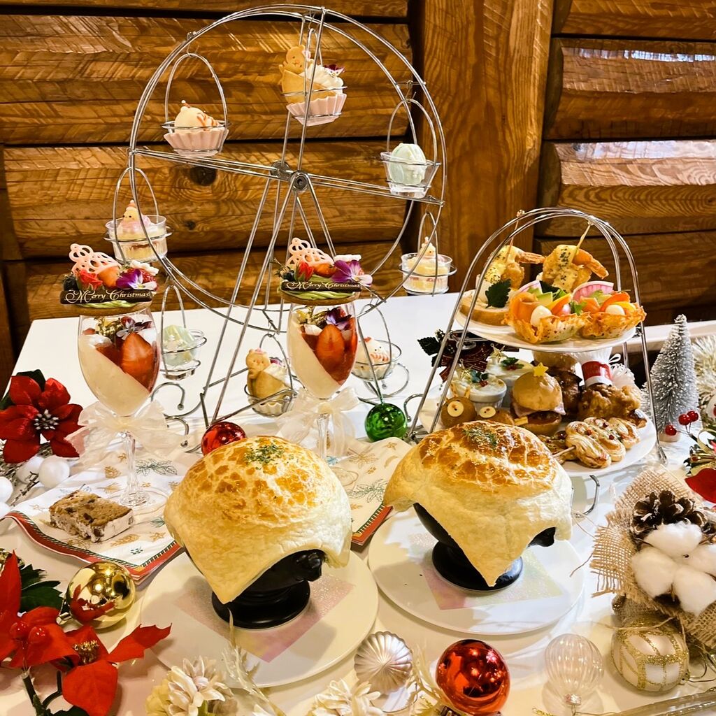 楽しいクリスマスをアフタヌーンティーに詰め込みました☆ 今回はスタンドはお料理メインとなってお食事のボリュームが増えています。更にスイーツの観覧車、クリスマスリースをイメージしたグラスパフェとパイシチューもセットになった盛りだくさんのアフタヌーンとなっております☆クリスマスのディナーとしてもお楽しみいただけます。